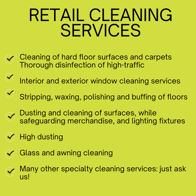 By entrusting us with your store's cleanliness, you can focus on engaging with customers, showcasing your products, and growing your business. Our experienced retail cleaners will ensure your space stays spotless, allowing you to never worry about cleanliness again.